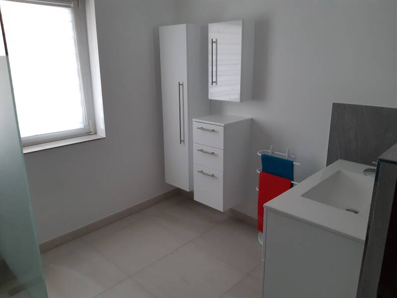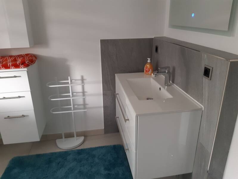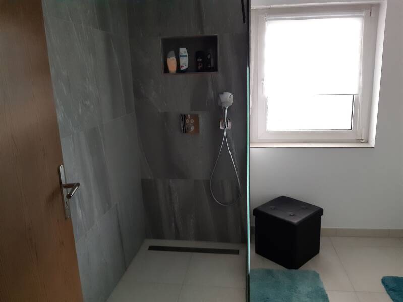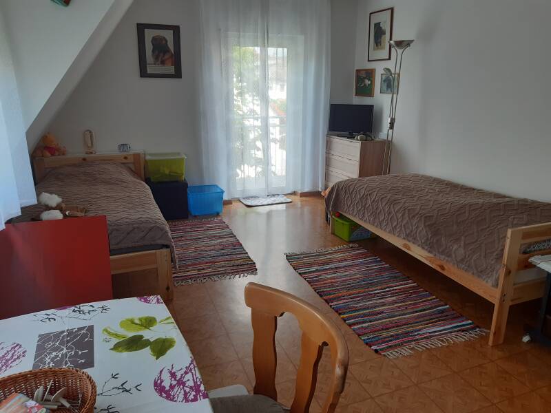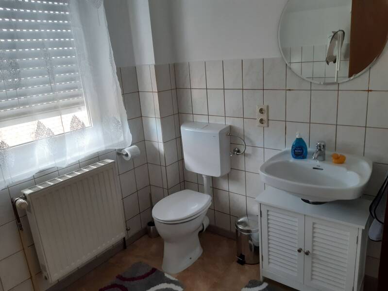 Die Wohnung verfügt über ein Wohnzimmer mit Schlafcouch, ein Schlafzimmer mit Doppelbett (Babybett auf Anfrage möglich) ,ein Kinderspielzimmer mit zwei Einzelbetten, eine große Wohnküche, ein Badezimmer mit bodenebener Dusche, ein kleines Badezimmer mit WC und ein Gäste-WC.